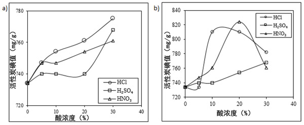 圖1:酸的濃度對(duì)活性炭碘值的影響,在(a)18°C和(b)50°C下進(jìn)行酸洗化學(xué)活化。