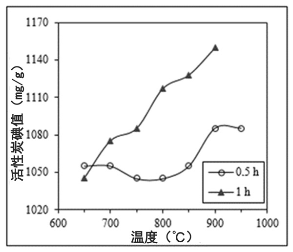 圖2:活化時(shí)間(0.5和1h)對(duì)用H 2 SO 4(在50°C下30%v / v)洗滌的廢活性炭的碘值(mg I 2/g活性炭)的影響在不同溫度(650°C至950°C)下重新活化。