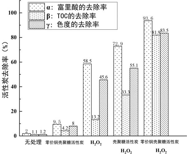 富里酸、TOC、色度的去除率分別以α、β、γ表示,如圖2所示 。從圖中可以看出,氧化劑H 2 O 2 的加入是至關重要的。實驗組用H 2 Ø 2倍加有較好的去除富里酸,TOC和色度相比,有活性炭催化劑的組比沒有催化劑的組實現了更高的去除率。三個指標的去除率都有所提高,尤其是TOC的去除率明顯提高,從13.2%提高到81.9%,說明零價銅的加入可以大大提高催化濕氧化法反應中富里酸的礦化率。相同條件下,礦化率比無零價銅實驗組高近2.5倍。零價銅對富里酸降解和脫色也有明顯效果。結果表明,本研究制備的零價銅殼聚糖活性炭催化劑對富里酸去除和有機化合物礦化具有較高的催化活性。