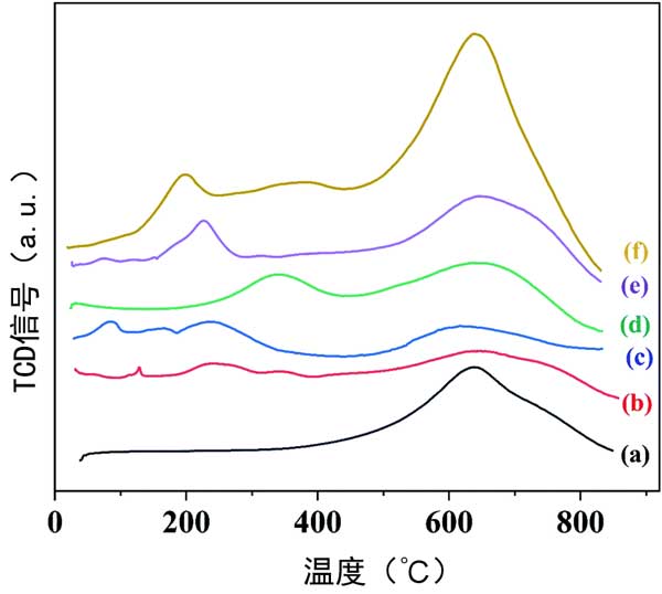 活性炭和載鉑活性炭催化劑的H2-TPR曲線在圖1顯示,它描繪了還原機制。如圖1a所示,在活性炭的H2-TPR曲線中觀察到630℃的峰,這歸因于活性炭的表面官能團。與活性炭相比,活性炭載鉑催化劑的H2-TPR曲線(圖1b)顯示了在240℃和340℃處的峰值,這是由Pt-O-Pt和Pt-O-C的還原產生的,分別進一步證明了活性炭載鉑催化劑的成功合成。在硫酸活化活性炭(圖1c)、氨基丙基三乙氧基硅烷活化(圖1d)的H2-TPR曲線中也觀察到了Pt-O-Pt或Pt-O-C的還原峰)、氧化氫活化(圖1e)和硝酸活化(圖1f),它們可以改善金屬物種的分散。此外,活性炭載鉑基催化劑曲線中的還原峰小于400℃,這表明鉑在甲基環己烷脫氫之前催化劑中處于金屬狀態。
