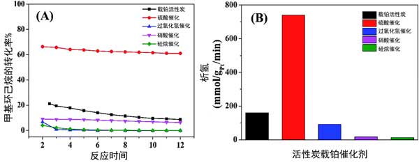 圖2:(A)甲基環己烷脫氫為甲苯的轉化曲線和(B)活性炭載鉑催化劑上的析氫直方圖。