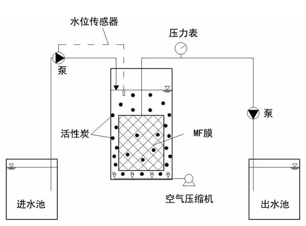 在這項研究中,依次進行了三個實驗階段,包括評估活性炭濃度對壬基酚聚氧乙烯醚去除效果的批量實驗,確定活性炭與膜過濾系統的合適通量,以及系統連續運行。首先,進行批量實驗以評估活性炭濃度的去除的影響。將6個密封瓶裝入200mL去離子水,并在每個瓶中加入活性炭,用量為25、50、100、150、200和250mg/L。初始壬基酚聚氧乙烯醚濃度控制在4mg/L。在30分鐘內以25rpm的速度搖動這些瓶子,溫度為32℃。然后,測量每個瓶子中的壬基酚乙氧基化物濃度以確定去除效率。批次實驗重復兩次。在下一階段,建立實驗室規模的活性炭與膜過濾系統,如圖1所示。由聚乙烯制成的平板膜組件,表面積為0.15平方米,孔徑為2.5μm浸入反應器中,工作容積為10L。通過數字壓力計每天記錄跨膜壓力。以65L/分鐘的流速供應空氣以避免活性炭在反應器中沉積。