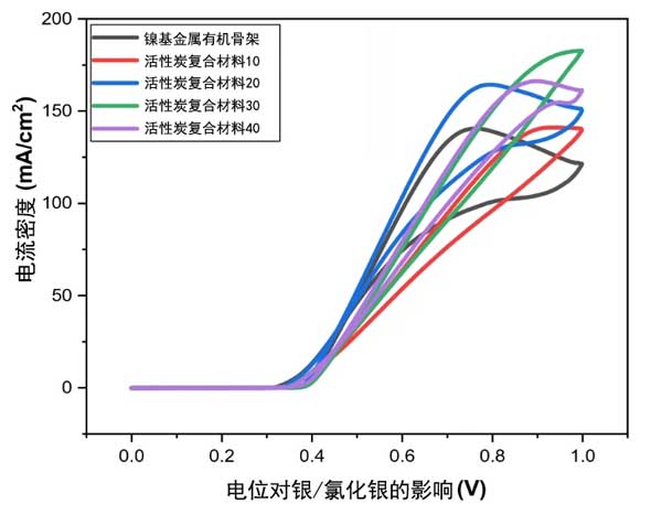通過在KOH和CH3OH中氧化甲醇,使用循環伏安法測試活性炭復合材料的電化學性能。具有活性炭復合材料的鎳金屬對甲醇氧化反應表現出更高的催化活性(見圖2)。在鎳金屬改性玻璃碳電極的情況下,峰值電流密度沒有添加活性炭的高。具有更高濃度活性炭(40mg)的樣品顯示出高峰值電流密度。隨著活性炭量(60mg)的進一步增加,峰值電流密度降會稍微降低。綜上所述,建議將活性炭的濃度增加到一定限度可以提高電流密度。然而,增加活性炭的濃度也可能對催化活性產生不良后果。此外,活性炭復合材料的CV曲線具有不同的形狀和峰位置,這是因為合成時活性炭分散不完全,也由于其大量使用導致催化劑發生簇集,導致覆蓋金屬有機框架表面,從而阻礙活性催化位點在低電位下進行反應,從而在高電位下發生電荷轉移。