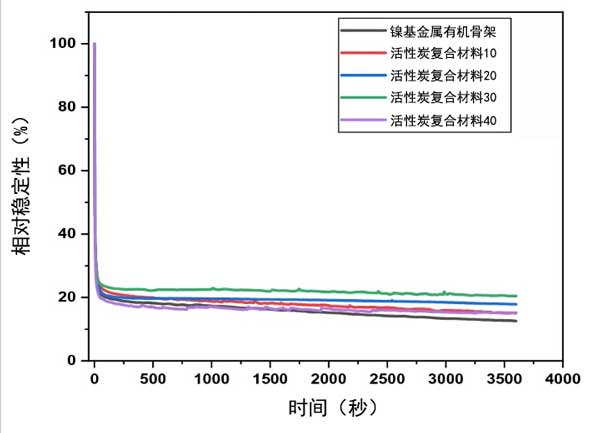 圖3:金屬框架及其復合活性炭在KOH和甲醇中的相對穩定性曲線。