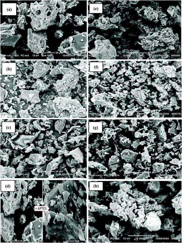 材料的SEM圖像在圖1中給出。活性炭具有不均勻的光滑表面,粒徑約為50μm(圖1a)。在用硝酸和過氧化氫進行氧化處理后,氧物質(羧基和硝酸鹽基團)被接枝,導致活性炭-OH的表面比活性炭更粗糙(圖1e)。通過APTES處理接枝氨基硅烷是成功的:活性炭-APTES和活性炭-OH-APTES表面分別比活性炭和活性炭-OH更光滑(圖1d和f)。裂縫和不均勻的空腔可用作氟化物的吸附位點。存在的粗糙表面和大量白色顆粒證實了Al顆粒的添加(圖2c、g和h)。這些白色顆粒可以對應于結合到材料表面的不同形狀和尺寸的Al納米顆粒的不同簇。