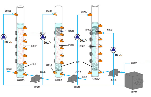 試驗(yàn)裝置如圖1所示,主體結(jié)構(gòu)采用有機(jī)玻璃制成,內(nèi)徑70mm,高度2000mm。過濾器包括進(jìn)水管、出水管、反沖洗水管、支撐層和過濾介質(zhì)層。200毫米高的支撐層由礫石制成。粒徑為0.5-1mm,和分別為1-2mm,過濾層的填料為石英砂和椰殼活性炭。過濾器A的填料層為1000mm石英砂。過濾器B、C的填料層均為上層200mm椰殼活性炭和下層800mm石英砂。根據(jù)水廠的設(shè)計規(guī)范,過濾器的過濾速度為8m/h,進(jìn)水流量為30L/h。過濾器A和B為單點(diǎn)進(jìn)水,過濾器C為兩點(diǎn)進(jìn)水,兩個進(jìn)水點(diǎn)分別位于過濾器頂部和20cm深度處;第一進(jìn)水點(diǎn)流量為20L/h,第二進(jìn)水點(diǎn)流量為10L/h。過濾器A和B是過濾器C的空白對照。過濾器每24小時反洗一次。