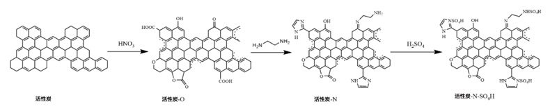 以活性炭為原料,用HNO3氧化,用乙二胺胺化。得到的中間體用硫酸水溶液處理以產生硫酸氫活性炭催化劑。通過過濾分離產物并在105℃干燥24小時;钚蕴康木唧w制備方案如圖1所示。