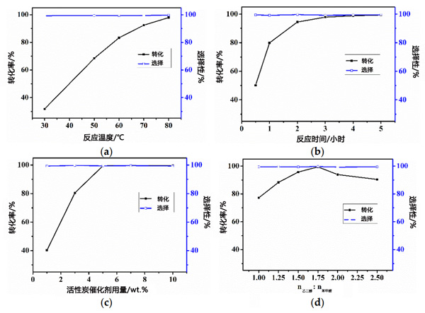 為了確定活性炭的催化性能,討論了反應溫度、反應時間、催化劑用量和醇/醛摩爾比對苯甲醛轉化率的影響。測試結果如圖2a-d所示。結果表明,隨著反應溫度、反應時間和催化劑用量的增加,苯甲醛轉化率逐漸升高,直至反應溫度達到80℃,反應時間達到5小時,催化劑用量為苯甲醛質量的5%。在上述條件下,苯甲醛轉化率在99%以上。當醇/醛的摩爾比低于1.75時,苯甲醛的轉化率隨著乙烯醇的增加而逐漸增加。當乙二醇用量繼續增加時,苯甲醛轉化率有一定程度的下降。苯甲醛轉化率降低的主要原因是隨著乙二醇用量的增加,反應體系中苯甲醛的濃度降低,導致分子間的碰撞減少。在所有條件下,苯甲醛乙二醇縮醛的選擇性均在99%以上,表明存在競爭催化機制。