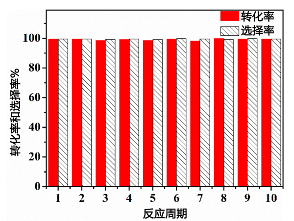 最后通過回收實驗測試了活性炭催化劑的穩定性,測試結果如圖3所示。在催化劑可重復使用性能的探索中,活性炭催化劑用溶劑環己烷洗滌,然后進入下一個反應循環。具體過程為將反應完成后的固體離心分離出來,再用環己烷洗滌固體3次,以完全去除前一輪反應表面殘留的少量液體。即使在連續運行10次后,催化劑的性能也沒有顯著降低,仍然達到99%的苯甲醛轉化率和99%的選擇性。因此,活性炭催化劑是用于研究苯甲醛乙二醇縮醛反應的優異且穩定的可回收固體酸催化劑。