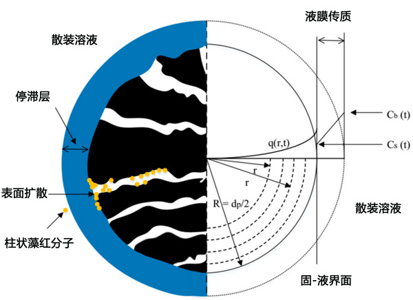 在第一實驗階段獲得的吸附平衡測試的實驗數據適合等溫線模型Langmuir、Freundlich和Redlich-Peterson。將最適合吸附平衡數據的等溫線模型的參數值應用于HSDM模型,以模擬SBA柱中的吸附過程。該模型考慮了發生在兩個連續擴散步驟中的吸附過程,即:通過活性炭顆粒周圍的固定流體層擴散(膜擴散)和通過活性炭內部孔的擴散(表面擴散),如圖2所示。