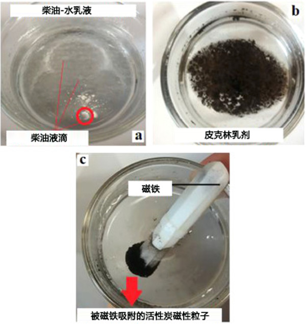 圖3:(a)柴油-水乳液,(b)皮克林乳液,(c)活性炭表面的柴油吸附。
