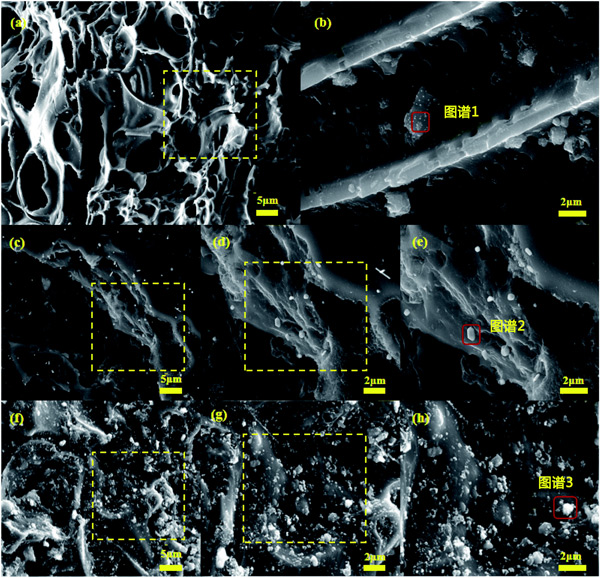 活性炭和鋅鹽失活催化劑的SEM圖像在圖2顯示。從圖2a和b可以看出,載銅活性炭催化劑具有良好的孔結構,不同尺寸的金屬氧化物顆粒分布在催化劑表面。放大5000倍后(圖2b),有利于反應氣體吸附的孔結構仍清晰可見。圖2c-e顯示ZnCl2-活性炭催化劑的大部分表壁坍塌,孔結構嚴重受損,表明ZnCl2摻雜后活性炭結構強度降低。圖2f-h表明ZnSO4-活性炭催化劑基體受到一定程度的破壞,表面粗糙,孔隙結構幾乎看不到,僅在某些位置附著較大的金屬氧化物顆粒,局部堆積。這種團聚現象發生在ZnSO4摻雜后的催化劑表面,不利于CO和NO氣體的吸附,導致脫硝活性下降。