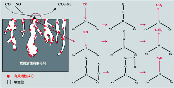 在活性炭催化劑表面通過選擇性催化還原技術(CO-SCR)反應進行的低溫脫硝是一種具有代表性的非均相催化體系,遵循Langmuir-Hinshelwood反應機理。因此,提出了圖3所示的脫硝機制,用于在活性炭催化劑上對NO進行CO還原。活性組分Cu均勻分散在活性炭上,增加了催化劑的比表面積和對NO和CO的吸附。這一結論表明Cu均勻分布在活性炭催化劑的表面,將脫硝效率提高到80%。CO吸附在催化劑表面以還原-O-Cu2+到=Cu+并生成CO2。吸附的NO解離成N和O,解離的N原子與NO分子結合形成N2O。據報道,NO的解離是CO誘導的NO消除的關鍵步驟。活性位點的釋放促進了CO的吸附,最后N2O和=Cu+反應生成N2和–O–Cu2+,這進一步促進了脫硝反應。在CO與NO的反應中,Cu2+↔Cu+交換可能會改變催化劑表面的價態,更多的氧空位可用于轉化過程,促進NO向N2的轉化。