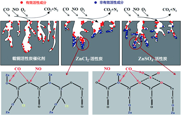 圖4:ZnCl2和ZnSO4對活性炭催化劑的失活機理。