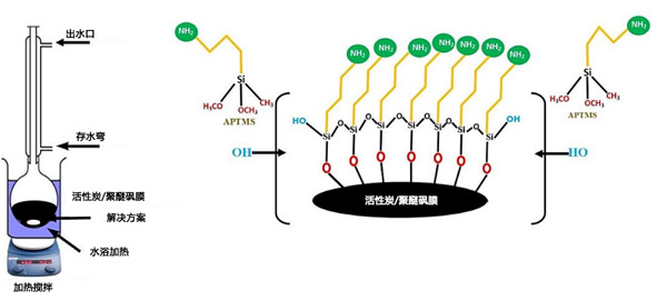 為了改性活性炭的表面,將15g非常細的干燥活性炭粉末與300mL甲苯和2mL氨丙基三甲氧基硅烷(APTMS)溶液在磁力攪拌下在40℃惰性環境下混合24小時。圖1表示實驗裝置的示意圖。使用實驗室旋轉蒸發儀去除溶劑。用甲苯和丙酮進一步洗滌所得的APTMS活性炭,然后在60℃下真空干燥6小時。這種干燥的活性炭被稱為改性活性炭,由表面上的胺官能團組成。改性活性炭在干燥條件下儲存以用于后續的實驗工作。