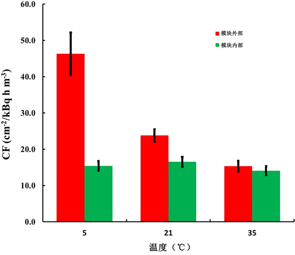 對(duì)于實(shí)驗(yàn),使用三種活性炭的織物為探測(cè)器設(shè)計(jì)了單獨(dú)的模塊。對(duì)于前兩種活性炭,模塊是HDPE,對(duì)于第三種活性炭,模塊是LDPE。單獨(dú)設(shè)計(jì)遵循上述方法,考慮到每種活性炭織物的確切單獨(dú)質(zhì)量。在所有設(shè)計(jì)中,不同溫度下的k(T)值根據(jù)方程式計(jì)算。活性炭的結(jié)果如圖2所示。5℃時(shí)的CF0比35℃時(shí)的CF0高305%。相比之下,對(duì)于放置在補(bǔ)償模塊中的傳感器,CF的變化在17%以內(nèi)(最大值/最小值=1.17)。值得注意的是,在模塊內(nèi)部不同溫度下暴露的傳感器的CF之間的配差異在95%的顯著性水平上沒(méi)有統(tǒng)計(jì)學(xué)意義。發(fā)現(xiàn)所描述的帶有補(bǔ)償模塊的探測(cè)器的CF明顯高于其他常用的無(wú)源氡探測(cè)器。