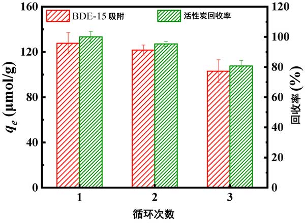 為研究活性炭處理洗脫液后的循環利用性能,采用甲醇洗脫活性炭進行再生回用。如圖3所示,在三個回收-吸附循環中,活性炭的吸附量略有下降,活性炭的吸附量保持在103μmol/g以上,下降了25μmol/g(下降了19%)。活性炭表現出良好的可回收性和可重復使用性,有利于實際應用。