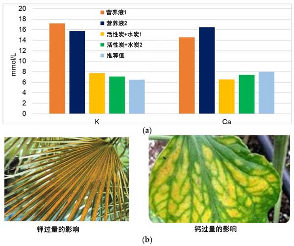 圖2:(a)通過(guò)活性炭和水炭處理將較高濃度的Ca和K降低到安全的可回收水平。(b)過(guò)量的鉀和鈣對(duì)植物生長(zhǎng)的影響。