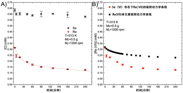 比較了Se(VI)+Re(VII)體系和單獨Re(VII)體系的吸附動力學曲線和吸附容量。得到的結果如圖1A和B所示,清楚地顯示了動力學曲線和吸附容量的差異。如圖1B所示,Re(VII)和Se(VI)的混合物對Re(VI)的吸附遠高于Se(VI),表明對Re(VII)的選擇性。處理240分鐘后,錸離子濃度從0.3mM下降到0.11mM,這意味著>60%的錸離子被吸附。然而,在硒吸附的情況下,如圖1所示A,Se(VI)的初始濃度(0.63mM)和最終濃度(0.59mM)之間的差異等于0.06%(圖1A)。該值在測量誤差范圍內,可以忽略不計。在這個過程中已經證實了活性炭對Re(VII)的選擇性。根據獲得的結果,確定將僅針對Re離子進行進一步的研究工作。