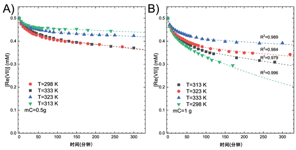 圖2顯示了溶液Re(VII)的初始濃度=0.5mM在不同溫度和活性炭量下的動力學曲線。圖2A和B顯示了當每200cm3溶液分別使用0.5和1g活性炭時的濃度變化。溶液中使用的活性炭量越大,Re(VII)濃度的降低越顯著。這種趨勢歸因于吸附劑的大比表面積,這導致了大容量。碳含量加倍使表面積加倍。