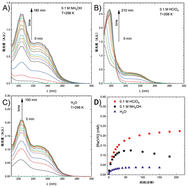 圖4:A在0.1M/HClO4,B在0.1M/NH4OH,C在H2O中解吸過程中獲得的UV-Vis曲線。D不同溶液中解吸過程的動力學曲線。