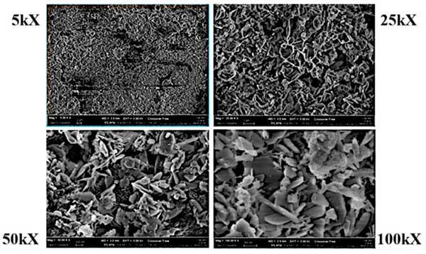 采用掃描電子顯微鏡(SEM)結合EDS分析來表征吸附劑樣品。局部化學分析通過EDS(能量色散X射線光譜法)實現。定性分析是通過識別光譜中報告的線來實現的,而定量分析(確定元素組成百分比)是通過測量樣品中存在的每種元素的線強度來進行的。圖1顯示了一系列活性炭的SEM圖像,放大倍數遞增:5000、25,000、50,000、100,000倍。SEM圖像說明了活性炭的多孔結構,突出了樣品表面不連續性的存在。高孔隙率的存在對于限制鼓風機系統過濾沼氣的能量損失是必要的。正如我們之前的一些研究報道的那樣,SEM圖像與EDS分析相結合可用于突出硫在孔隙和金屬基催化位點內的吸附和保留。