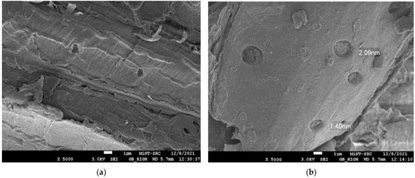 使用FESEM分析觀察了活性炭產(chǎn)品的浸漬和碳化溫度影響的形態(tài)變化。圖1a、b描繪了木質(zhì)素在被激活之前的表面形態(tài)。它顯示出厚而平坦的圖案,中間有小裂縫。這歸因于大量的木質(zhì)素,一種酚類聚合物,賦予植物結(jié)構(gòu)強度,使其具有堅硬粗糙的木材狀結(jié)構(gòu)。在圖1b中,發(fā)現(xiàn)前體具有壓實的表面,上面有淺而堵塞的孔隙圖案。這可能是由于烘箱干燥過程中預處理和加熱過程的反應。從圖1a、b,由于無孔表面的存在,表面清楚地顯示為不令人滿意的吸附材料。