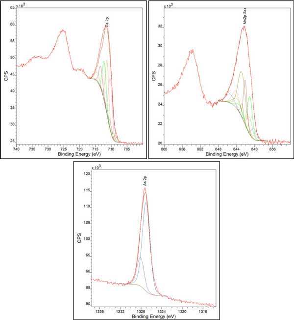 圖2:負(fù)載FeMn的活性炭、As曝光后的Fe(左上)、Mn(右上)和As(底部)XPS峰的解卷積。