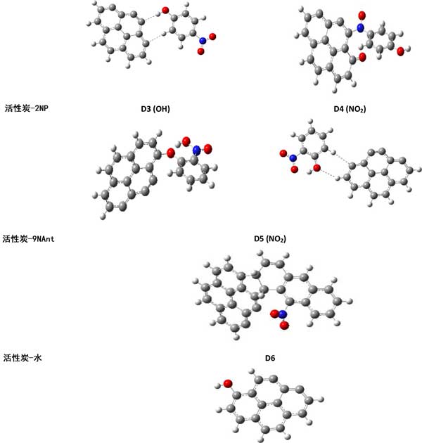 研究的第一步是描述代表固體活性炭吸附劑以及吸附物的分子結構。在之前的理論工作中,已經驗證了石墨晶體結構、苯環簇模型等不同分子結構的適用性。選擇并修改了具有四個苯環的芘的模型以獲得最終的C16H6結構。第二步,通過2NP、4NP、9NAnt和水的一個分子接近本體,衍生出復雜的結構。第三步是研究水和污染物的共吸附以確定濕度所起的作用。在第四步中,將第二個污染物分子添加到先前計算的復合物中。