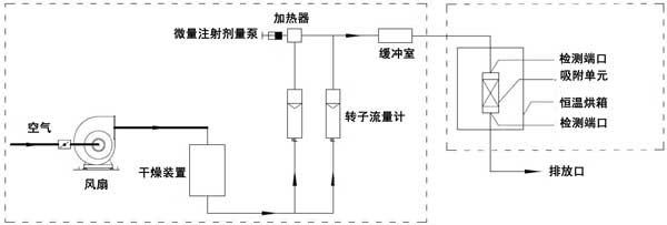 動態(tài)吸附實驗在室溫(25℃)下進行。實驗裝置由氣體分配系統(tǒng)和吸附系統(tǒng)兩部分組成。吸附系統(tǒng)由恒溫箱和吸附單元組成。檢測口位于吸附系統(tǒng)之前和之后。動態(tài)法測定活性炭對脈沖負荷緩沖性能的裝置如圖1所示。本實驗以乙醇或二甲苯為單一檢測對象。氣體分配系統(tǒng)包括風扇、干燥裝置、轉(zhuǎn)子流量計、微注射計量泵、加熱器和緩沖室。使用FT-IR傅里葉氣體分析儀作為測量設(shè)備。在氣體分配系統(tǒng)中,在短時間內(nèi)(2分鐘和5分鐘),微注射計量泵的注射量迅速增加到原始體積的預(yù)定倍數(shù)(10倍和20倍),以產(chǎn)生脈沖負載。在吸附系統(tǒng)中,吸附單元內(nèi)放置活性炭。吸附單元的直徑為31mm;钚蕴康奶畛涓叨确謩e為2cm、4cm、6cm、8cm。將吸附裝置置于恒溫箱內(nèi)。吸附劑和吸附物的入口空氣保持在室溫。進行了吸附劑在室溫下吸附吸附質(zhì)的脈沖加載實驗。潔凈空氣通過干燥裝置后,利用轉(zhuǎn)子流量計將其按特定比例分成兩個通道。通過微注射泵將特定濃度的乙醇或二甲苯氣體注射到氣體中。另一種氣體用作稀釋氣體。兩種氣體流入緩沖室,完全混合后進入恒溫箱。穩(wěn)定的氣體按照實驗設(shè)定的濃度、流量和溫度進入吸附單元。在通過吸附單元之前和之后測量乙醇或二甲苯的濃度。