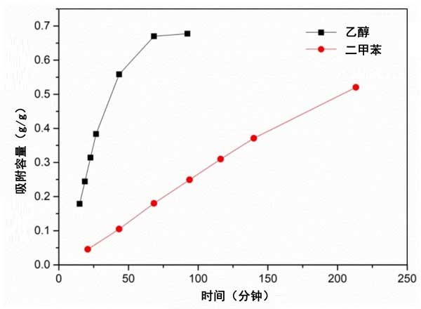 圖2:乙醇和二甲苯在活性炭上的吸附等溫線。