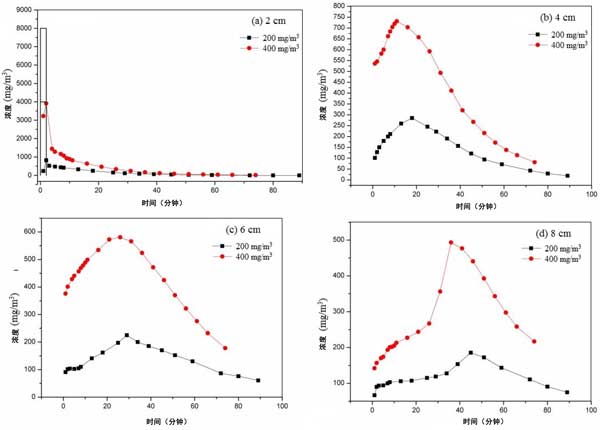 選擇平衡吸附濃度為200和400mg/m3的活性炭。截面風速設(shè)定為0.3m/s。乙醇的脈沖濃度是原始平衡濃度的20倍。脈沖時間為2分鐘。不同活性炭床層高度、不同平衡吸附濃度下脈沖后出口濃度變化曲線如圖3所示。