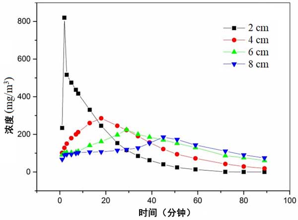 乙醇作為吸附物。截面風速設(shè)定為0.3m/s。飽和吸附濃度為200mg/m3。脈沖時間為2分鐘。脈沖倍數(shù)為20倍。通氣方式為正壓通氣。不同高度出口濃度隨時間變化曲線如圖4所示。