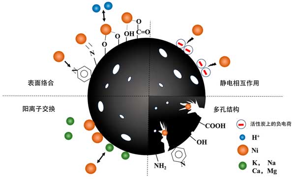 活性炭改性后高效去除廢水中的鎳,用了一種新的改性方法來制備活性炭。改性劑為硫酸四氨合銅(II)一水合物([Cu(NH3)4]SO4·H2O)。活性炭通過吸附有效去除水中的Ni(II)。與未改性的活性炭相比,活性炭的改性導致比表面積和總孔體積降低,而改性導致比表面積和總孔體積增加氧和氮的存在,表明含O和含N官能團的結合。改性活性炭相對于活性炭表現(xiàn)出優(yōu)異的吸附能力。值得注意的是,改性活性炭表現(xiàn)出強大的緩沖能力和對pH變化的適應性。Ni(II)在活性炭上的吸附機制包括表面絡合、陽離子交換和靜電相互作用。本研究概述了一種經(jīng)濟有效的方法來制備用于吸附廢水中Ni(II)的活性炭,并闡明了潛在的吸附機制。