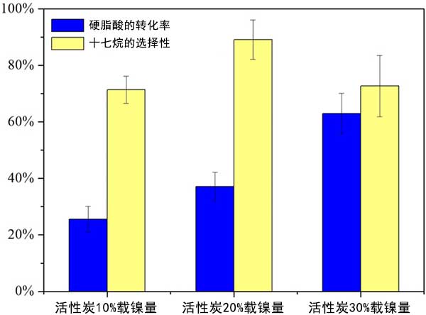在相同的實驗條件下在三種活性炭載鎳催化劑上檢測硬脂酸的脫羧作用,其中鎳負載量不同(10%,20%和30%)。活性炭的鎳負載對硬脂酸轉化率和十七烷選擇性的影響如圖2所示。從圖中可以看出,硬脂酸的轉化率隨著活性炭上鎳負載量的增加而增加。十七烷的選擇性超過20%載鎳量的活性炭遠高于10%和30%載鎳量的活性炭。經過活性炭催化后得到產物除十七烷外,還檢測到其他產物如癸烷,十一烷,十二烷,十三烷,十四烷,十五烷,十六烷,十七烷,十八烷和十八烷醇。
