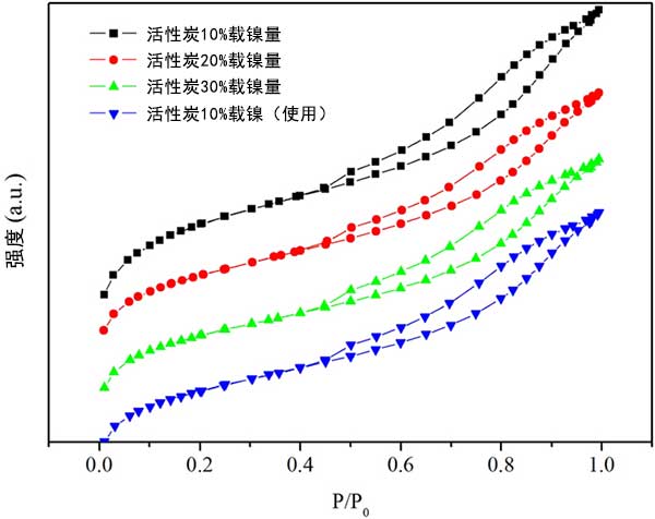 為了研究活性炭載鎳催化劑的可重復使用性,首先在真空下過濾分離先前實驗的廢活性炭,然后用丙酮徹底洗滌,接著用水洗滌多次。然后將過濾的活性炭在強制通風烘箱中在110℃下干燥,然后在管式爐中在氮氣流下在500℃下煅燒4小時。經過從新活化的活性炭的測試,活性炭對硬脂酸的產率和選擇性轉化為十七烷在重復三次催化后性能幾乎沒有下降。選擇性保持在約90%,在無溶劑體系中保持穩定。活性炭的N2吸附-脫附等溫線如圖3所示,表明隨著鎳負載量的增加,活性炭的表面積和孔體積減小,表明過量的鎳顆粒可能阻塞一定量的活性炭孔并減少孔體積。