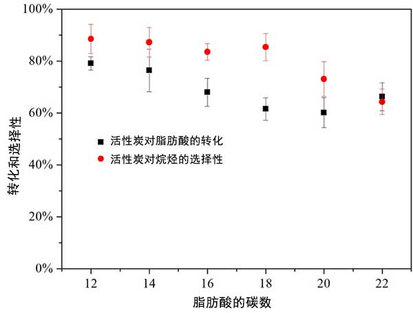 在350℃下研究活性炭對月桂酸,肉豆蔻酸,棕櫚酸,硬脂酸,花生酸的脫羧作用,如圖4所示。這些結果表明,月桂酸,肉豆蔻酸,棕櫚酸,硬脂酸,花生酸的轉化率分別為79.1%,76.4%,67.9%,61.5%,60.2%,對相應烷烴的選擇性為88.5%分別為87.2%,83.5%,85.4%,73.1%。在相同的反應條件下,具有較小碳數的脂肪酸的轉化率高于具有較大碳數的那些。月桂酸,肉豆蔻酸,棕櫚酸和硬脂酸的酸度降低,與脂肪酸轉化的減少順序一致。這表明脂肪酸的酸性可能促進脫羧。此外,具有大碳數的脂肪酸對相應烷烴的選擇性低于具有小碳數的脂肪酸,表明在活性炭反應體系中具有大碳數的脂肪酸傾向于裂化。