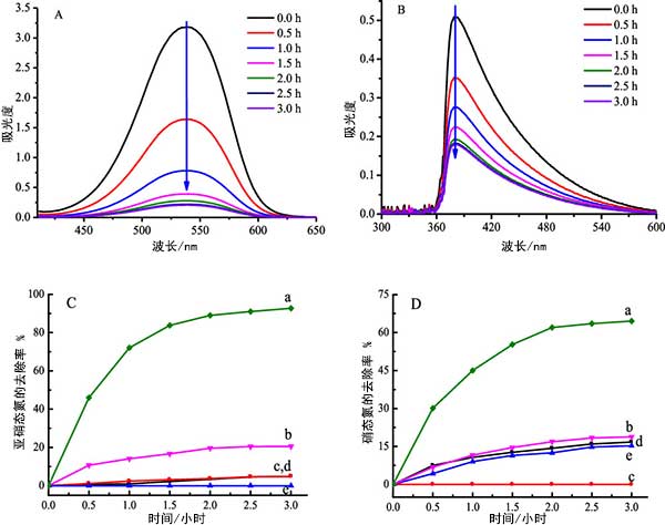 亞硝酸鹽和氨的記錄的紫外可見吸收光譜分別在圖3中。圖3AB明確顯示當活性炭用作光催化劑時,在厭氧條件下,亞硝酸鹽和氨的濃度與輻照時間同時下降。對照試驗也在活性炭催化劑存在或不存在下進行,照射或在黑暗中或不存在一種組分時進,亞硝酸鹽和氨的去除率如圖3CD所示。在活性炭鋅鐵氧體照射下,氨降解的平均去除率達到64.3%,而在沒有活性炭的情況下去除率僅為18.8%。結果明顯的是的活性炭鋅鐵氧體具有同時去除亞硝酸鹽和氨的光催化功能。