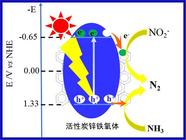 在紫外可見光照射下,基于活性炭鋅鐵氧體催化劑通過兩個步驟成功地同時去除亞硝酸鹽和氨。通過氣相色譜檢測產物表明在光催化過程中氮氣被釋放出來。XPS測量和鋅鐵氧體能帶結構分析表明,鋅鐵氧體的還原電位低于亞硝酸鹽的還原電位,因此光生電子可以在照射下將亞硝酸鹽還原為氮氣。對比下高于氨的電位,因此光生空穴可以將氨氧化成氮氣。活性炭引起帶隙的紅移,光生電子空穴對的分離,亞硝酸鹽和氨的吸附,促進光催化活性。