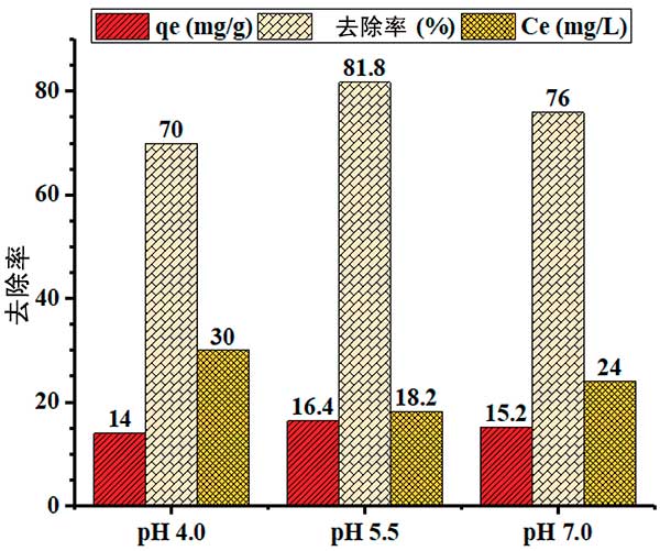 圖3:pH對活性炭的吸附容量和鉛去除百分比影響。