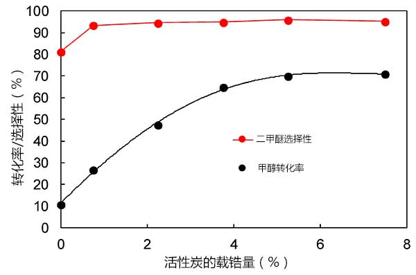 圖2:穩(wěn)態(tài)甲醇轉(zhuǎn)化率和對二甲醚的選擇性活性炭的鋯負(fù)載的變化。