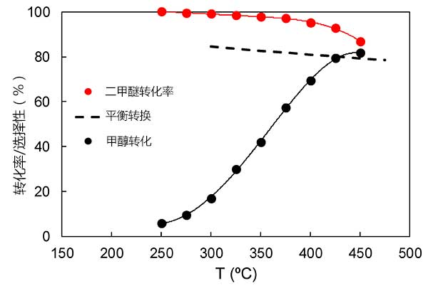 圖3:溫度變化對甲醇轉(zhuǎn)化率和二甲醚的選擇性影響。