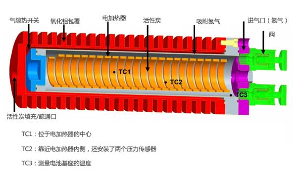 排出壓力約為3.5MPa的實驗結果如圖4所示。250秒后,加熱功率為500W,中心溫度超過476℃,而電池底座溫度則為76℃。然而,將電池達到其穩(wěn)態(tài)溫度分布需要大約60分鐘,其中電池基座中的溫度為166℃。活性炭的溫度不允許超過526℃。 60分鐘,加熱功率逐漸降低,以保持最高溫度低于526℃,壓力高于3.5MPa。由于電池基座的溫升速率隨時間降低,輸送的氮量也減少了。因此,在15分鐘后結束放電階段僅從活性炭吸附池釋放4.6g氮。圖4中的冷卻階段持續(xù)約100分鐘,并且如果放電階段在15分鐘后結束(此時基礎溫度僅為126℃),則可以減少冷卻階段;钚蕴恐械募訜岷屠鋮s速率以及溫度分布與數(shù)值分析估計的相似。這表明簡化的數(shù)值傳熱分析為吸附池中的傳熱提供了令人滿意的估計。