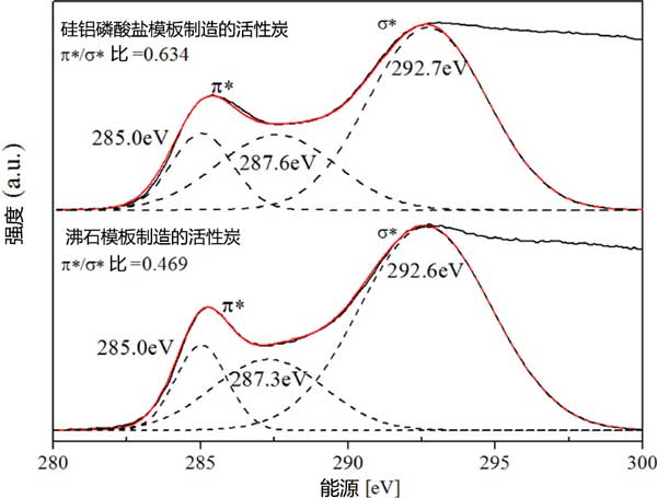 兩種模板化制造活性炭的EELS光譜在圖3顯示。這兩條曲線的sp 2/sp 3碳的分數已經顯示出與碳原子的雜化有關,并且一系列高斯峰被擬合到下的去卷積。定量計算表明,硅鋁磷酸鹽模板化活性炭的光譜在兩個峰之間具有統計學上更高的比率,與無定形碳相比,這兩種活性炭的sp 2/sp 3碳具有更高比例。