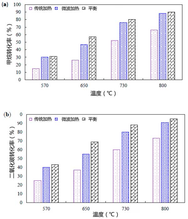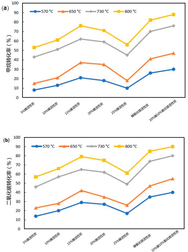 圖2:(a)二氧化碳和(b)甲烷轉化率。