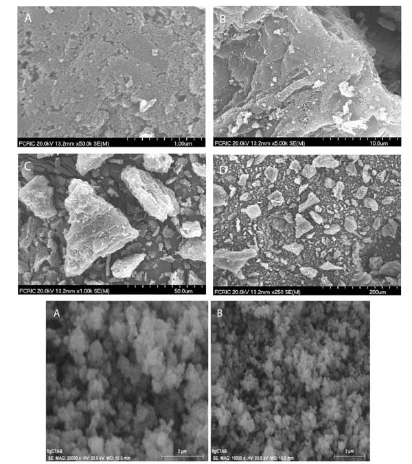 圖1呈現活性炭的掃描電子顯微鏡(SEM)圖像,其示出了活性炭的結構和表面表征。圖像顯示碳顆粒的平均尺寸為約20nm,并且這些顆粒聚集在一起并形成平均尺寸為25μm的角形簇。孔隙率為17.78%。可以看出簇的表面是平坦的,粗糙的和多孔的。最后兩幅顯示的活性炭摻雜二氧化鈦的圖像。在嚴格攪拌下,將丁醇鈦溶液加入到含有活性炭的擬均勻溶液中,可能形成二氧化鈦,其中活性炭顆粒將其裝飾。
