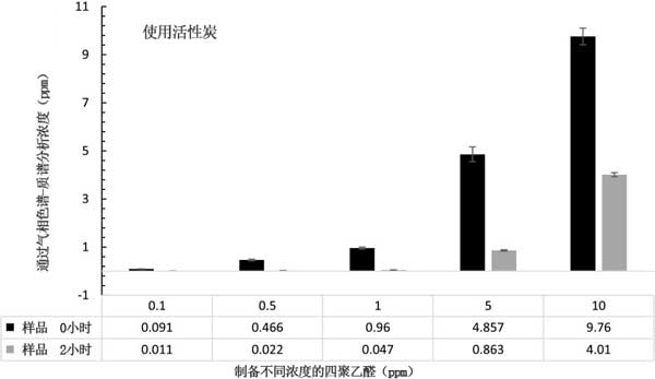 二氧化鈦摻雜的碳催化劑被認為對水中的四聚乙醛降解無效,特別是與活性炭相比。圖3示出了前和2小時處理被碳摻雜二氧化鈦后在溶液聚乙醛的濃度2在UV-C光納米催化劑。在較高的初始濃度的金屬醛溶液如5、7.5、10和12ppm時,與較低濃度的降解相比,降解稍微更顯著(2-9%)。