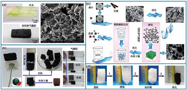 活性炭氣凝膠由納米結構活性炭材料組成,其中孔隙充滿氣體。因為可以結合有益吸附性質和高的熱穩定性,并且擁有電子傳導性,和可成為催化劑載體,油或有機溶劑吸附和儲能方面的潛在應用。活性炭氣凝膠還有一個特征是它們的超輕質。除了高度多孔和輕質之外,另一個優點是在轉化成活性炭氣凝膠后引入導電性的可能性,因此允許在電化學區域(例如,電池,超級電容器或導電催化劑載體)中的應用。隨著新型活性炭材料的發展,已經生產出具有超低密度和優異導電性的石墨烯或基于納米碳管的活性炭氣凝膠作為新興的新型氣凝膠材料,這進一步拓展了氣凝膠材料的應用領域。除了高級碳材料能制造氣凝膠外,使用生物質做成的活性炭氣凝膠如圖7所示。