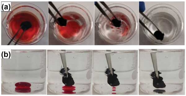 圖4:(a)通過使用間隔10秒的活性炭氣凝膠顯示庚烷吸附過程的照片。(b)照片顯示使用活性炭氣凝膠吸附氯仿的過程5秒內完全被吸收。