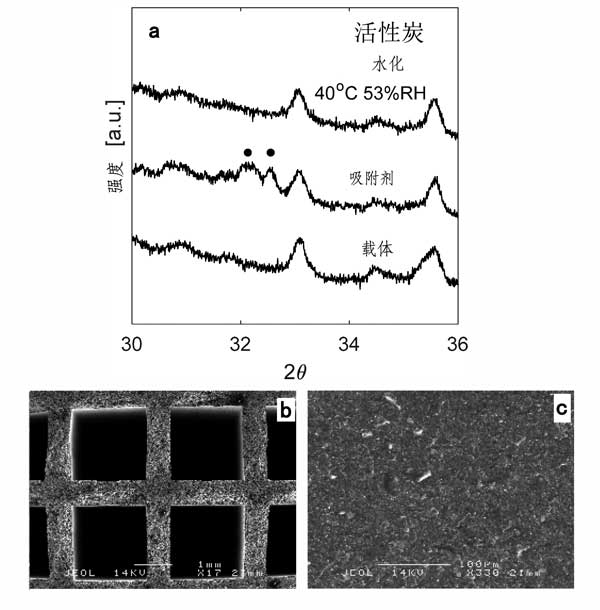 圖1a顯示了在40℃和相對濕度為53%下水合處理后活性炭載體,吸附劑和活性炭X射線衍射圖。由于碳酸鉀倍半水合物的反射特性的存在證實了鹽在載體上的負載。由于載體中加載的鹽量低,解釋了這些反射的低強度,5.58wt%。其余的峰對應于載體中的不同相,例如碳和二氧化硅。圖1b顯示了活性炭載體的SEM照片。如圖中所看到的圖中,信道是正方形幾何形狀的具有每邊1.979±0.006毫米的長度,并且所述通道之間的壁的厚度是0.651±0.022毫米。圖1c示出了通道的內壁的表面上,他們看起來很同質。
